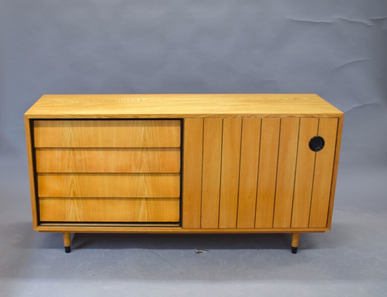 Dieses Sideboard (Schiebetüren, runde Griffschalen, konische Füße) habe ich in meiner Restaurierungswerkstatt in Berlin umfassend überarbeitet. Ziel der Möbelrestaurierung: Spuren der Nutzung respektieren, aber die Funktion und die gestalterische Klarheit des Entwurfs wieder voll zeigen – ein Ansatz, wie ich ihn in der Restaurierung von Holz konsequent verfolge.