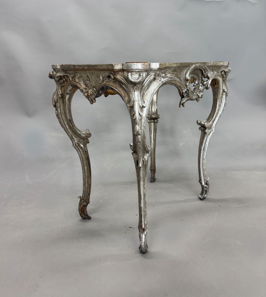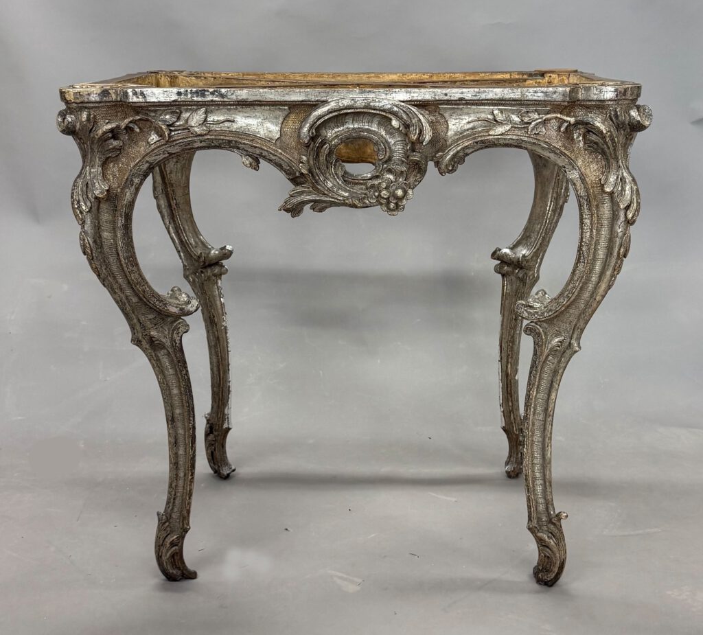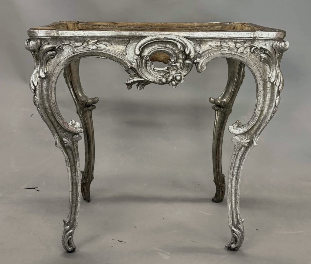 In unserer Restaurierungswerkstatt in Berlin wurde eine Rokoko-Konsole aus der Zeit um 1740–1750 restauriert. Das Möbel wurde mir von einem privaten Sammler anvertraut und wird einem Entwurf von Johann Michael oder Johann Christian Hoppenhaupt zugeschrieben. Ursprünglich vergoldet, später vollständig versilbert, zeigte das Möbel erhebliche Alterungsspuren: stark oxidiertes Blattsilber, teils verlorene Oberflächen sowie freiliegendes rötliches Poliment der ersten Vergoldung. Ziel war es, die Konsole in ihrer historischen Wirkung zu bewahren und zugleich strukturell zu sichern.