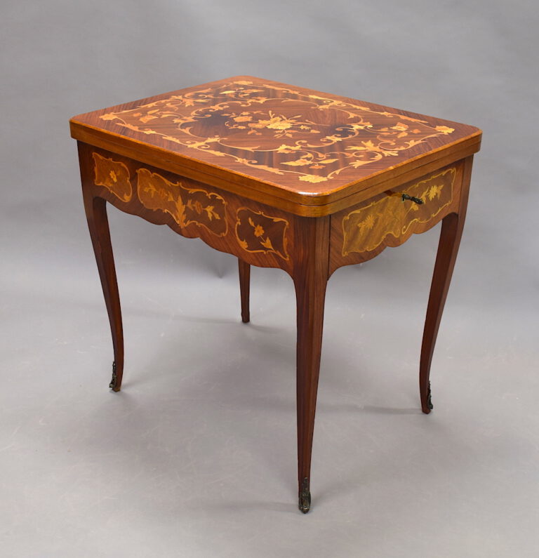 In unserer Restaurierungswerkstatt Berlin erreichte uns ein besonderer Spieltisch aus der Zeit um 1880. Das historische Möbel zeigte feine Intarsien; einige florale Motive waren jedoch verloren. Mit präziser Handarbeit wurden die fehlenden Blumenmotive ergänzt, bis das Dekor wieder geschlossen und stimmig wirkte.