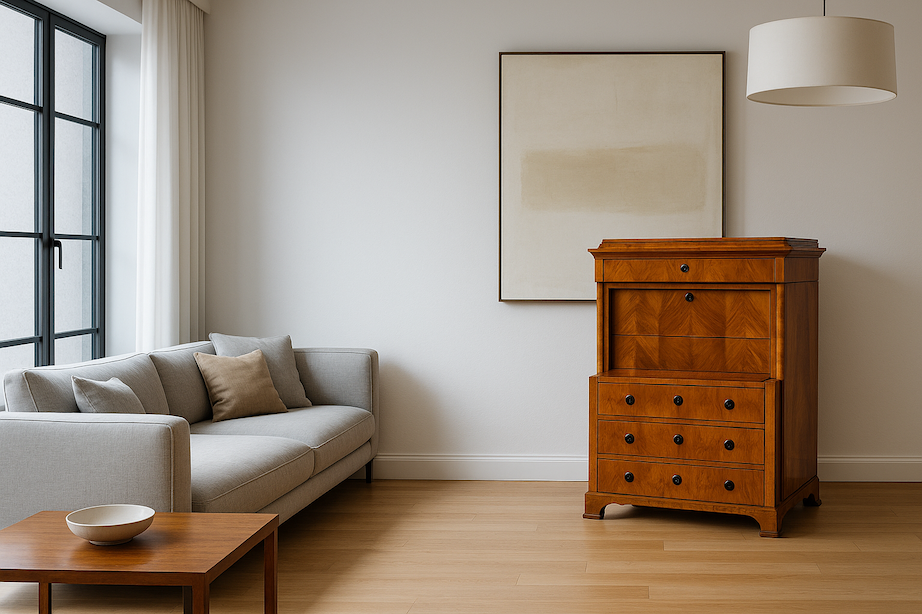 Während ein Biedermeier-Sekretär oder eine klassizistische Kommode früher selbstverständlich Teil eines Interieurs war, wirken solche Stücke heute als bewusst gesetzte Akzente. Sie bringen Wärme, Charakter und eine Erzählung in Räume, die von klaren Linien und minimalistischer Gestaltung geprägt sind.